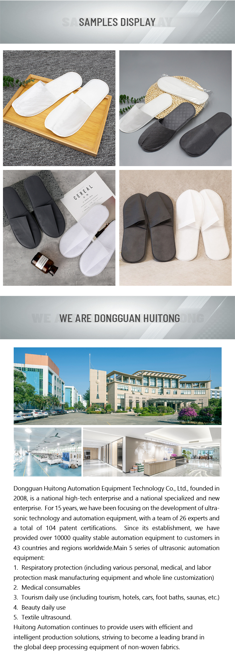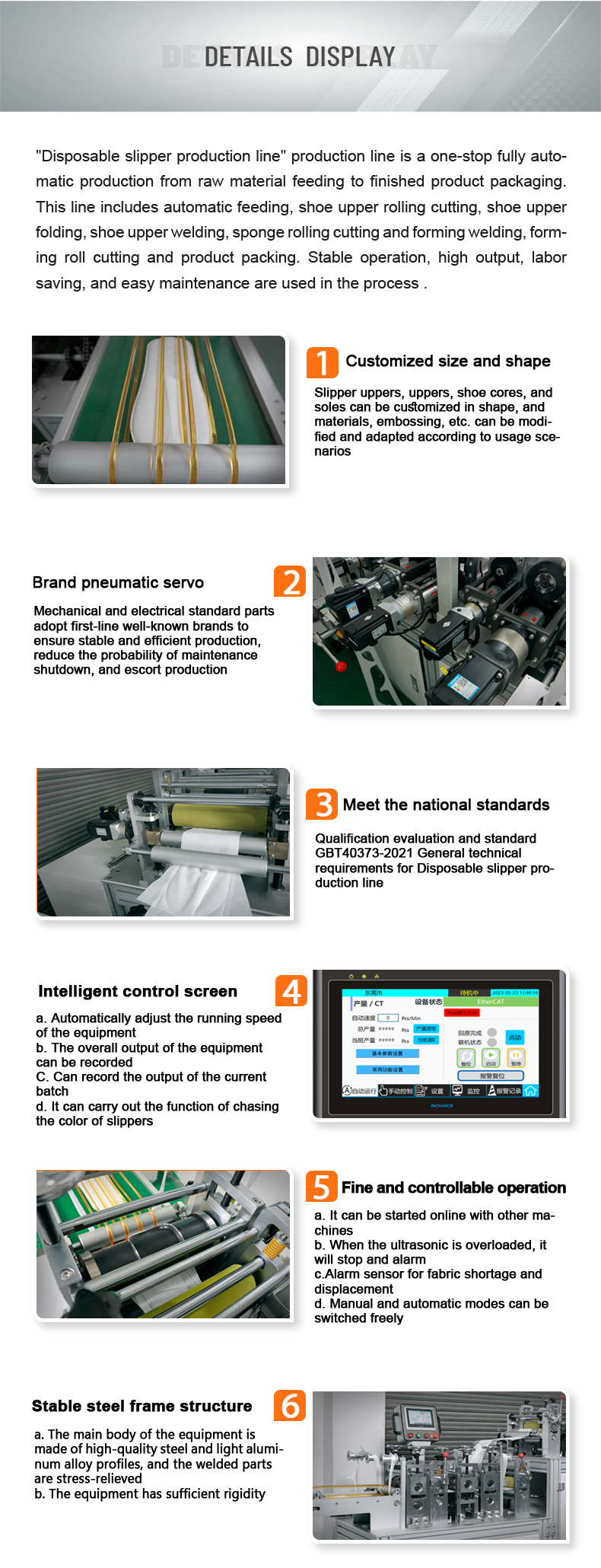 “一次性拖鞋+包装”生产线是从原材料进料到成品包装的一条龙全自动生产线。该生产线包含自动上料、鞋面滚切、鞋面折叠、鞋面焊接、海绵滚切成型焊接、成型滚切、成品包装等工序。该生产线运行稳定、产量高、节省人工、维护简便。